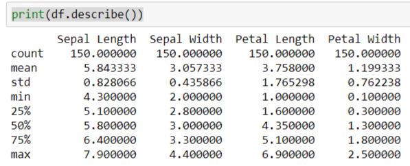 Pandas' dataframe can do more other than just showing us the content of data, try using its describe() function: print(df.describe()) See? It can calculate the means and standard deviations of our data set: