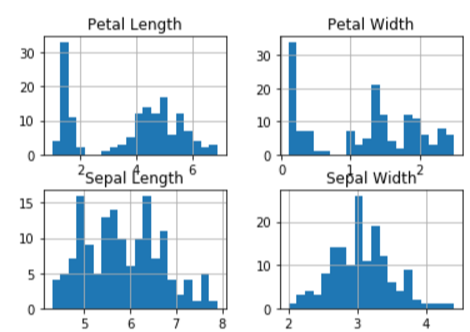 It can even plot a histogram for us, its hist() function transforms data into histogram data. I set the bin size set to 20 for accuracy and resource balance. Then use matpotlib (plt) module to show the graph: df.hist(bins=20) plt.show() A histogram with data attributes inside our data set is then generated: