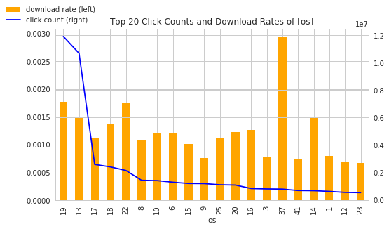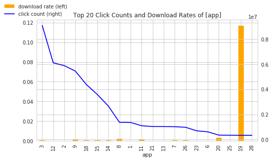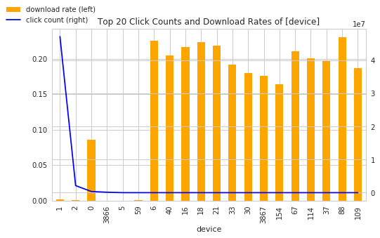 We know certain values dominated a feature, but how do they take part in the download rate? Let's find it out. This time, we take a look on the top 20 clicks in each feature, and see how they perform in term of download rate. We go for the 'device' feature first this time. def displayCountAndDownloadRate(df, groupby, countby, top): counts = df[[groupby]+[countby]].groupby(groupby, as_index=False).count().sort_values(countby, ascending=False) download_rates = df[[groupby]+[countby]].groupby(groupby, as_index=False).mean().sort_values(countby, ascending=False) df_merge = counts.merge(download_rates, on=groupby, how='left') del counts,download_rates gc.collect() df_merge.columns = [groupby, 'click_count', 'download_rate'] df_merge[groupby] = df_merge[groupby].astype('category') ax = df_merge[:top].plot(x=groupby, y="download_rate", legend=False, kind="bar", color="orange", label="download rate (left)") ax2 = ax.twinx() df_merge[:top].plot(x=groupby, y="click_count", ax=ax2, legend=False, kind="line", color="blue", label="click count (right)") ax.set_xticklabels(df_merge[groupby]) ax.figure.legend(loc='upper left') ax.set_title("Top {} Click Counts and Download Rates of [{}]".format(top, groupby)) del df_merge gc.collect()