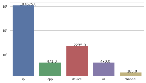 cols = ['ip', 'app', 'device', 'os', 'channel'] uniques = [len(df_train[col].unique()) for col in cols] ax =sns.barplot(cols, uniques, log=True) for p in ax.patches: ax.annotate(p.get_height(), (p.get_x()+p.get_width()/3, p.get_height()+0.1))
