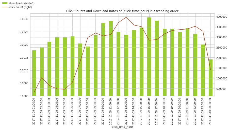 As of 2017 November (the training data record date), click farm and click flooding are still the major players in click fraud (reference: The State of Mobile Fraud: Q1 2018). Click farm companies should hire click farmers and operate click flooding in regular working hours to control the cost, i.e. around 0900 to 1800. The usage of click bots in non-office hours is omitted, as the use of bots in mobile fraud was still low in 2017. Then we take a look on the click time distribution. But first, since those click time records in training data are in UTC, we have to convert them to China time, i.e. GMT +8. After that, we round those click time records to nearest hour. df_train['click_time_china'] = pd.to_datetime(df_train.click_time) df_train['click_time_china'] += pd.to_timedelta(8, unit='h') df_train['click_time_hour']=pd.to_datetime(df_train['click_time_china']).dt.round('H') And get the click counts and download rates in 24 hours.