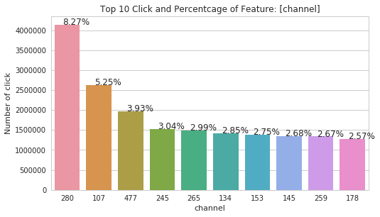 def displayCountAndPercentage(df, groupby, countby): counts = df[[groupby]+[countby]].groupby(groupby, as_index=False).count().sort_values(countby, ascending=False) percentage = df[groupby].value_counts(normalize=True)*100 ax = sns.barplot(x=groupby, y="is_attributed", data=counts[:10], order=counts[groupby][:10]) ax.set(ylabel='Number of click', title='Top 10 Click and Percentcage of Feature: [{}]'.format(groupby)) i = 0 for p in ax.patches: ax.annotate('{:.2f}%'.format(percentage.iloc[i]), (p.get_x()+p.get_width()/3, p.get_height()+0.5)) i = i + 1 del counts, percentage gc.collect() displayCountAndPercentage(df_train, 'channel', 'is_attributed')