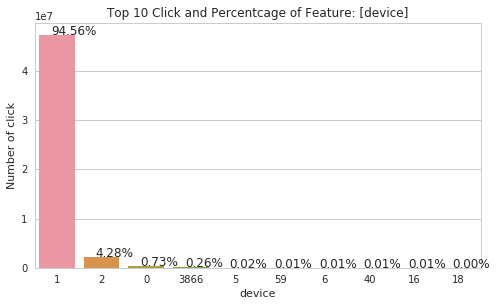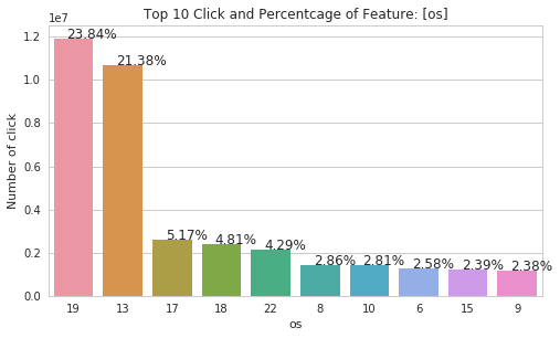 There are interesting plots on 'os' and 'device' features. As those features are dominated by certain values. The 'device' feature is dominated by the encoded value '1' with 94.56%. And we are pretty sure that the '1' device is Android and the '2' device is iPhone. So we can also assume os '19', '13', '17', '18' and '22' are all Android OS in different versions.