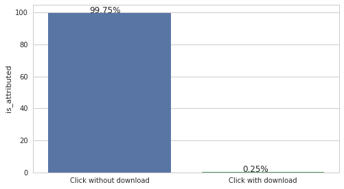 Now we have the training data, it is time to run our EDA (exploratory data analysis) on the click industry. The challenge is about finding the fraud rate, so the first thing I would like to know is, how "fake" of those clicks are in the training data? i.e. What is the percentage of a click leading to an app download? download_rate = df_train['is_attributed'].value_counts(normalize=True)*100 ax = sns.barplot(['Click without download', 'Click with download'], download_rate) for p in ax.patches: ax.annotate('{:.2f}%'.format(p.get_height()), (p.get_x()+p.get_width()/3, p.get_height()+0.1))
