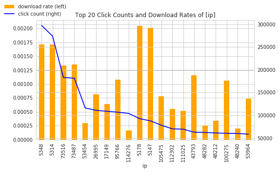 There are some findings from above charts: Android OSes hardly make an impact on download rate, it matches our observation on Top device Click/Download rate chart. The top 20 ip clickers did download! Although their download rates are tiny, a download is a download, we can't write off them for being big clickers. For channel and app, the download rate does not correlate the number of clicks much. Certain apps and channels just out-download others, no matter the size of clicks.