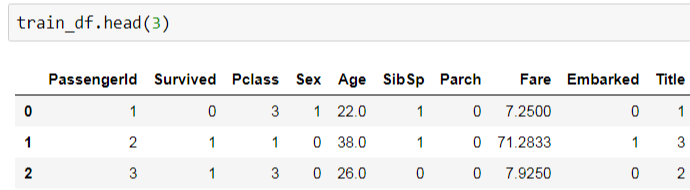 title_mapping = {"Mr": 1, "Miss": 2, "Mrs": 3, "Master": 4, "Rare": 5} train_df['Title'] = train_df['Title'].map(title_mapping) train_df = train_df.drop(["Name", "Ticket", "Cabin"], axis=1)