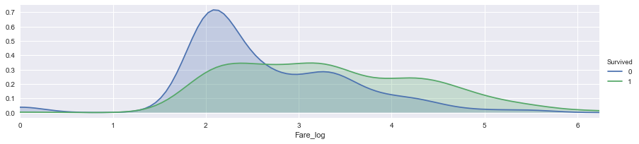 facet = sns.FacetGrid(train_df, hue="Survived",aspect=4) facet.map(sns.kdeplot,'Fare_log',shade= True) facet.set(xlim=(0, train_df['Fare_log'].max())) facet.add_legend() plt.show() bins = (-1, 2, 2.68, 3.44, 10) group_names = [1,2,3,4] categories = pd.cut(train_df['Fare_log'], bins, labels=group_names) train_df['FareGroup'] = categories