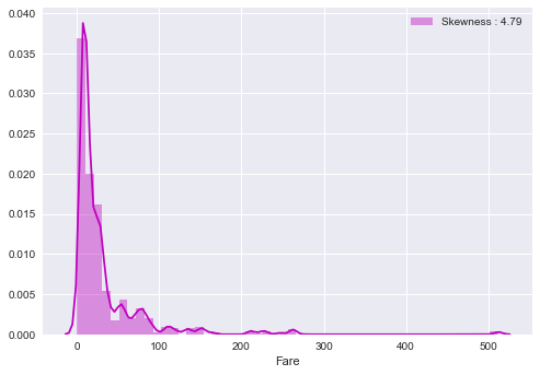 It is time to put passengers' fare into our model learning routine, but: fare_dist = sns.distplot(train_df["Fare"], color="m", label="Skewness : %.2f"%(train_df["Fare"].skew())) fare_dist = fare_dist.legend(loc="best") plt.show()