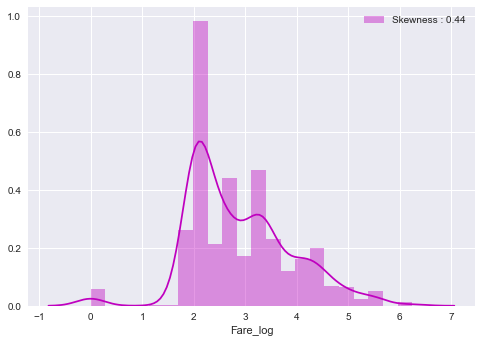 train_df["Fare"] = train_df["Fare"].fillna(train_df["Fare"].median()) train_df['Fare_log'] = train_df["Fare"].map(lambda i: np.log(i) if i > 0 else 0) fare_log_dist = sns.distplot(train_df["Fare_log"], color="m", label="Skewness : %.2f"%(train_df["Fare_log"].skew())) fare_log_dist = fare_log_dist.legend(loc="best") plt.show()