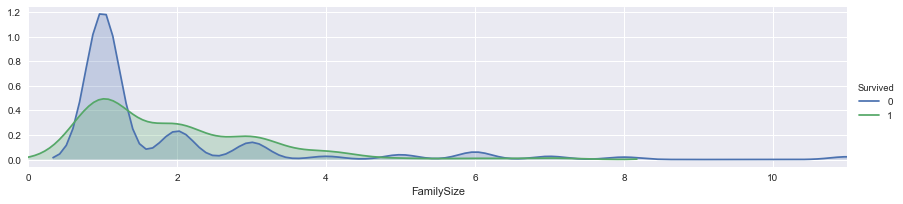 Now we focus on the numeric features. "SibSp" and "Parch" represent siblings, spouses, parents and children, i.e. family members. We make a new feature, "FamilySize", for storing these 2 features. And check its relationship with survival rate using kernel density estimate graph. train_df['FamilySize'] = train_df['SibSp'] + train_df['Parch'] + 1