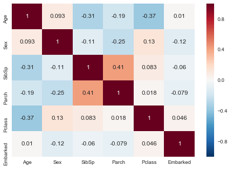 age_heat = sns.heatmap(train_df[["Age","Sex","SibSp","Parch","Pclass","Embarked"]].corr(),annot=True) plt.show()
