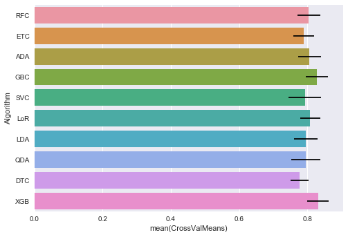 And the results are:[RFC] Mean: 0.80365793 Std. Dev.: 0.033661 [ETC] Mean: 0.78902622 Std. Dev.: 0.030693 [ADA] Mean: 0.80585518 Std. Dev.: 0.032839 [GBC] Mean: 0.82720350 Std. Dev.: 0.033126 [SVC] Mean: 0.79242197 Std. Dev.: 0.047439 [LoR] Mean: 0.80810237 Std. Dev.: 0.029757 [LDA] Mean: 0.79574282 Std. Dev.: 0.034687 [QDA] Mean: 0.79466916 Std. Dev.: 0.042005 [DTC] Mean: 0.77669164 Std. Dev.: 0.026440 [XGB] Mean: 0.83053683 Std. Dev.: 0.031099