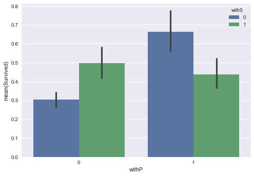 train_df['withP']=0 train_df['withS']=0 train_df.loc[train_df['SibSp'] > 0, 'withS'] = 1 train_df.loc[train_df['Parch'] > 0, 'withP'] = 1 sns.barplot(x="withP", y="Survived", hue="withS", data=train_df) plt.show()