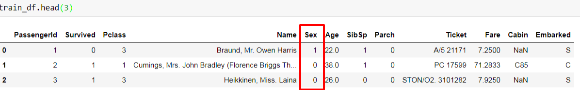 Our objective on data wrangling is to transform raw data to machine read-able data. Let' start from the easiest step first, the "Sex" feature. We open our machine's "eyes" by mapping male as "1" and female as "0": train_df["Sex"] = train_df["Sex"].map({"male": 1, "female":0}) Then we have changed the original "male" and "female" values to machine read-able 1/0 values: