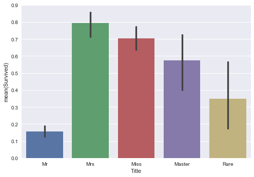 Now we only have one non-numeric feature to solve: "Name". We find that other than first name and last name, there is title stored in the "Name" column as well. Let's take a closer look on the title value. #get title from name train_df['Title'] = df['Name'].apply(lambda x: x.split(",")[1].split(".")[0].strip()) print(train_df['TicketPrefix'].value_counts(ascending=True, dropna=False)) Ms 1 Mme 1 Capt 1 Sir 1 Jonkheer 1 the Countess 1 Lady 1 Don 1 Major 2 Col 2 Mlle 2 Rev 6 Dr 7 Master 40 Mrs 125 Miss 182 Mr 517 We group different titles according to their social status and similarity. train_df["Title"] = train_df["Title"].replace(['Lady', 'the Countess','Countess','Capt', 'Col','Don', 'Dr', 'Major', 'Rev', 'Sir', 'Jonkheer', 'Dona'], 'Rare') train_df['Title'] = train_df['Title'].replace('Mlle', 'Miss') train_df['Title'] = train_df['Title'].replace('Ms', 'Miss') train_df['Title'] = train_df['Title'].replace('Mme', 'Mrs') And see their relationship with survival rate. import matplotlib.pyplot as plt import seaborn as sns