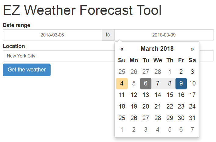 So we import those links in the index.html view: <head> <script src="https://cdnjs.cloudflare.com/ajax/libs/jquery/3.3.1/jquery.min.js"></script> <link id="bs-css" href="https://netdna.bootstrapcdn.com/bootstrap/3.0.3/css/bootstrap.min.css" rel="stylesheet"> <link id="bsdp-css" href="https://cdnjs.cloudflare.com/ajax/libs/bootstrap-datepicker/1.7.1/css/bootstrap-datepicker3.min.css" rel="stylesheet"> <script src="https://cdnjs.cloudflare.com/ajax/libs/bootstrap-datepicker/1.7.1/js/bootstrap-datepicker.min.js"></script> <link id="weather-css" href="https://cdnjs.cloudflare.com/ajax/libs/weather-icons/2.0.9/css/weather-icons.min.css" rel="stylesheet"> </head> And create our query form with Datepicker: <div class="row"> <div class="col-md-6"> <label style="width: 100%;">Date range <div id="ezw-dateinput"> <div class="input-daterange input-group" id="datepicker"> <input type="text" class="input-sm form-control" name="date_from" id="date_from" /> <span class="input-group-addon">to</span> <input type="text" class="input-sm form-control" name="date_to" id="date_to" /> </div></div> </label> </div> </div> <div class="row"> <div class="col-md-6"> <label style="width: 100%;">Location <input type="text" class="input-sm form-control" id="location" name="location" required> </label> </div> </div> <div class="row"> <div class="col-md-6"> <button type="button" class="btn btn-primary" id="gtw">Get the weather</button> </div> </div> <div class="row"> <div class="col-md-12" id="result"></div> </div> Add JavaScript here to interact with our Flask controller using AJAX. <script> $(document).ready(function () { $('#ezw-dateinput .input-daterange').datepicker({ format: "yyyy-mm-dd", todayHighlight: true });