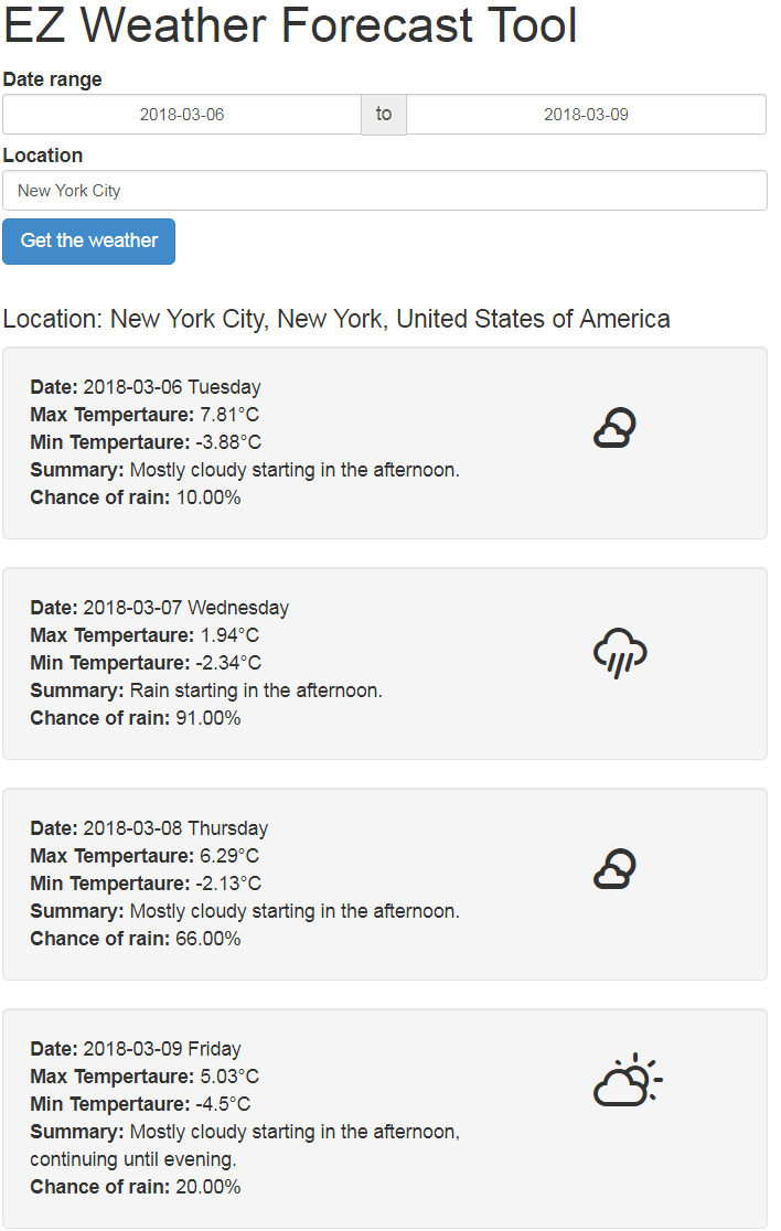 Hope you all can enjoy this EZW web app. You can build extra features on it, like an auto-fill function on location or add more fields on the report view model. Feel free to try and explore the code, and make your own customized weather forecast app.