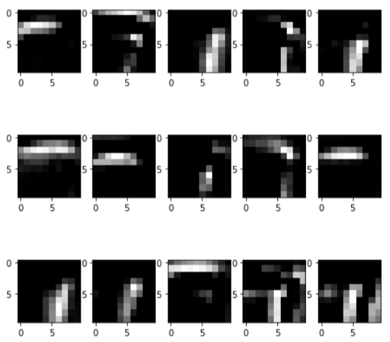 After the first 2 layers, we now have 1,260,000 inputs. On our 3rd layer, another convolutional layer, we are going to make 1,260,000 * 15 (number of filters) = 18,900,000 outputs. But don't panic, we only show one set of the activation maps here, i.e. 15 images. display_activation(activations, 5, 3, 2)