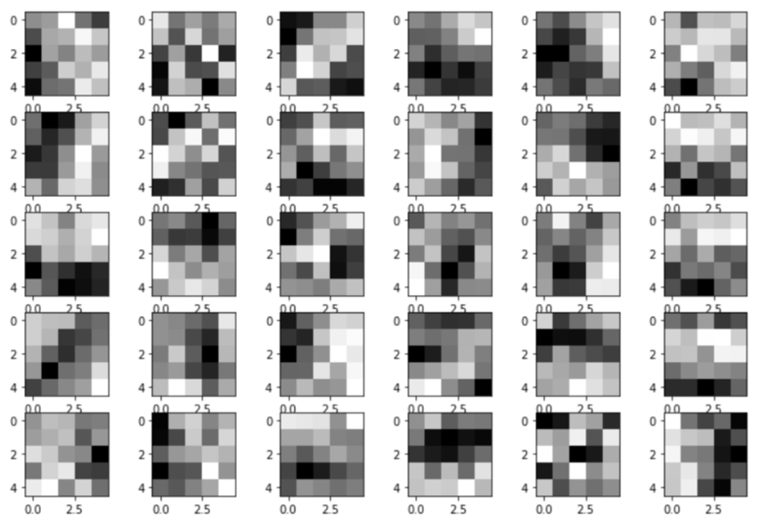 The first layer of our model, conv2d_1, is a convolutional layer which consists of 30 learnable filters with 5-pixel width and height in size. We do not need to define the content of those filters. As the model will learn building filters by "seeing" some types of visual feature of input images, such as an edge or a curve of an image. The 30 filters of our first layer should look like: