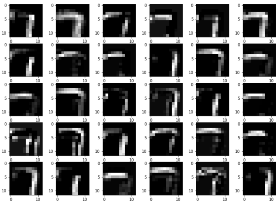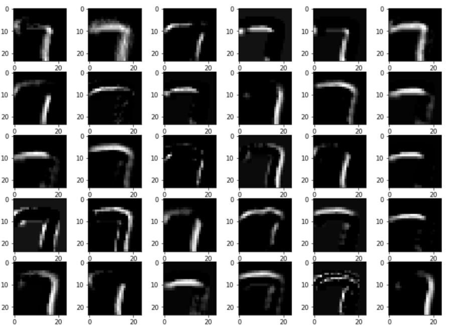 Then we display the 30 activation maps from the first layer in 6 columns and 5 rows.
